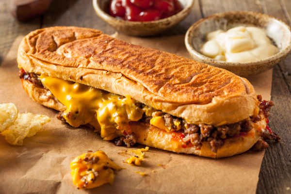 A hero-style sandwich with beef, cheese, lettuce, tomato, onion, and mayonnaise.