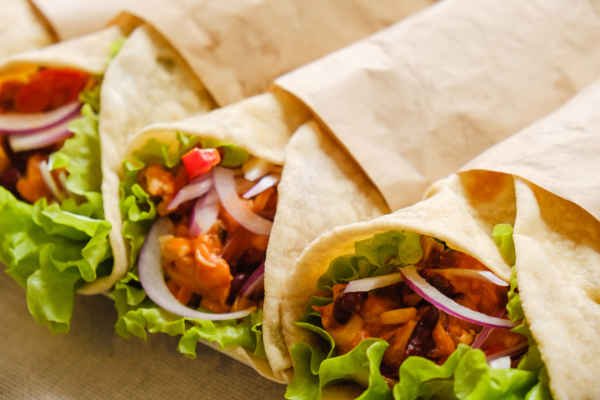 Wrap with grilled chicken, romaine lettuce, croutons, parmesan and Caesar dressing.